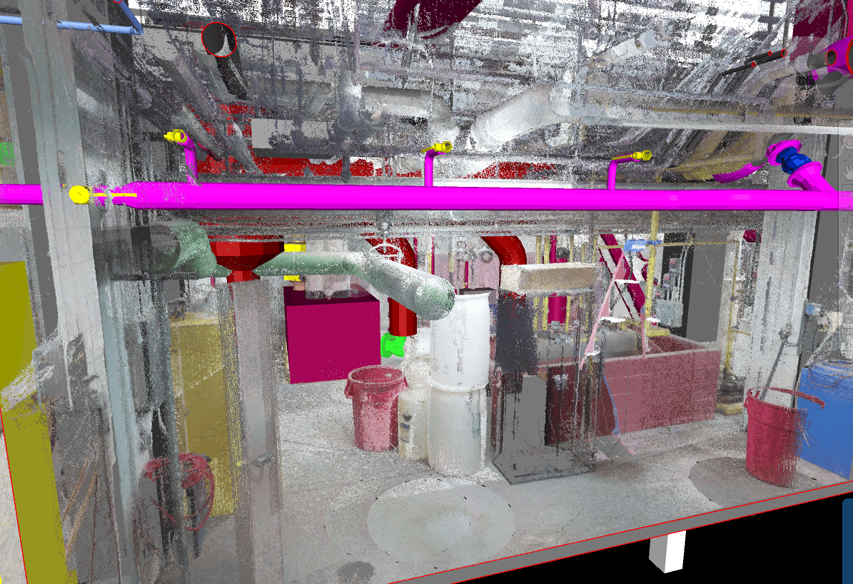 Image 1: This image shows gas connections for future phase 2 boilers that are overlayed on the existing condition of the laser scan.