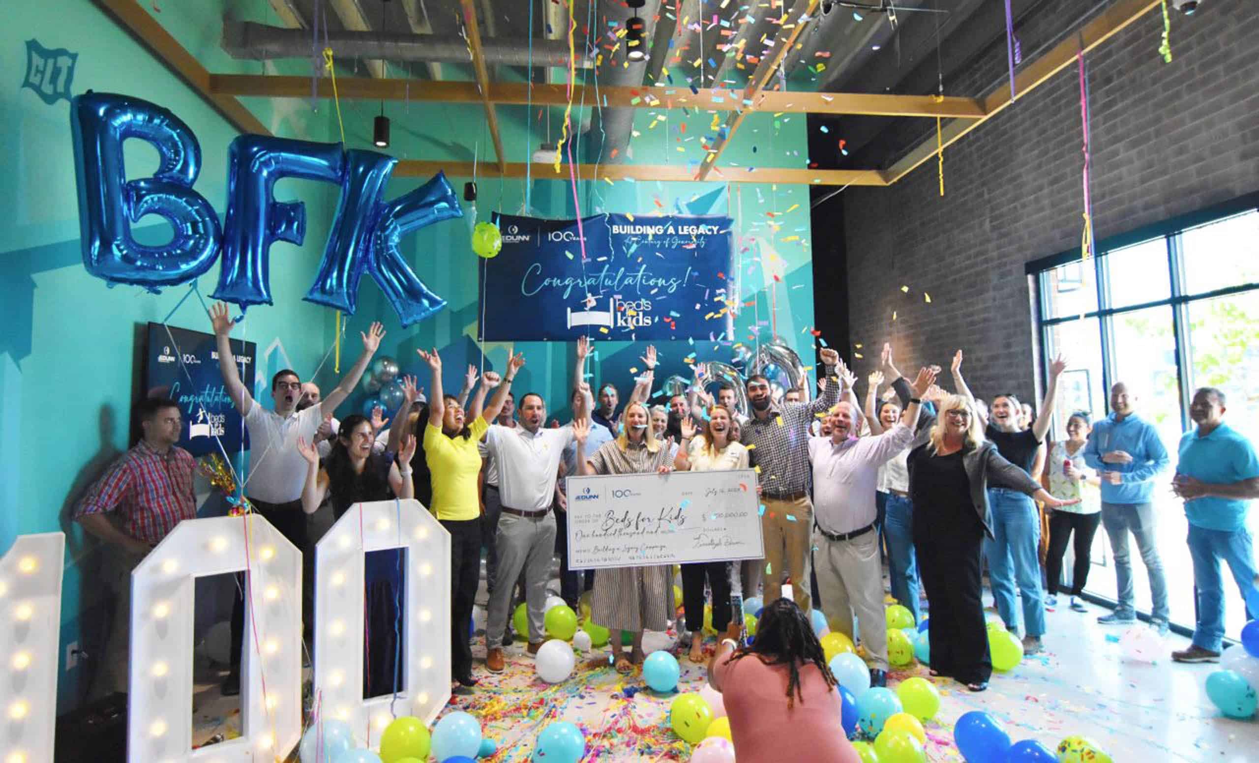 Charlotte, NC. July 16, 2024 – Beds for Kids is the proud recipient of a $100,000 grant from JE Dunn Construction. In honor of its Centennial celebration, JE Dunn is extending its community impact by choosing ten worthy organizations to receive a gift of $100,000 to further their important work. This community impact campaign, Building a Legacy: A Century of Generosity, will be empowering nonprofit organizations from across the country. Beds for Kids, whose mission is to provide beds and essential furniture to children and their families in need, received this grant on July 16, in a surprise ceremony.