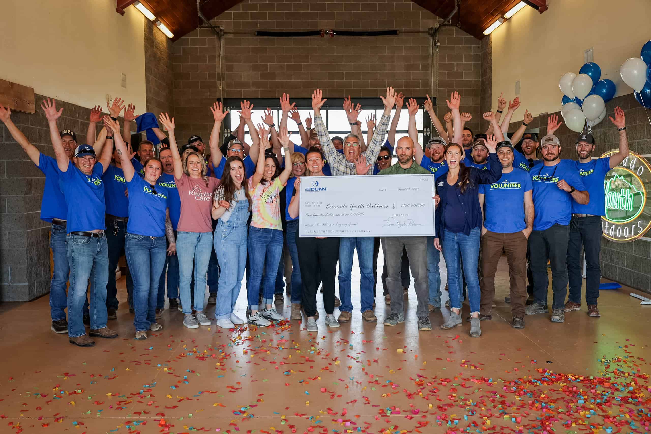 Fort Collins, CO. April 23, 2024 – Colorado Youth Outdoors (CYO) is the proud recipient of a $100,000 gift from JE Dunn Construction. In honor of its Centennial celebration, JE Dunn is extending its community impact by choosing ten worthy organizations to receive a gift of $100,000 to further their important work. This community impact program, Building a Legacy: A Century of Generosity, will be honoring nonprofit organizations from across the country. CYO, a nonprofit dedicated to building relationships through outdoor recreation, received this grant on Tuesday, April 23rd, during a National Volunteer Week surprise ceremony.