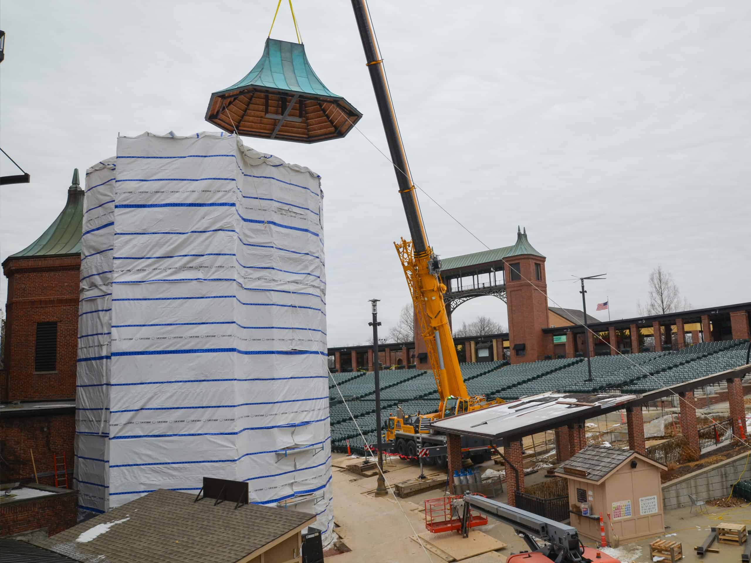 The first phase of this renovation involved constructing two nearly 70-foot-tall masonry towers that flank each side of the stagehouse, designed to replicate the exiting towers built in the 1950s. Each tower is topped with a patinated copper roof that matches the existing roof spires on the historic towers. In collaboration with Zahner, JE Dunn designed and engineered two symmetrical halves for each roof structure. The structures were clad with copper at Zahner’s offsite facility before being shipped to the jobsite, where they were assembled, hoisted into placed, and capped with a decorative spire.