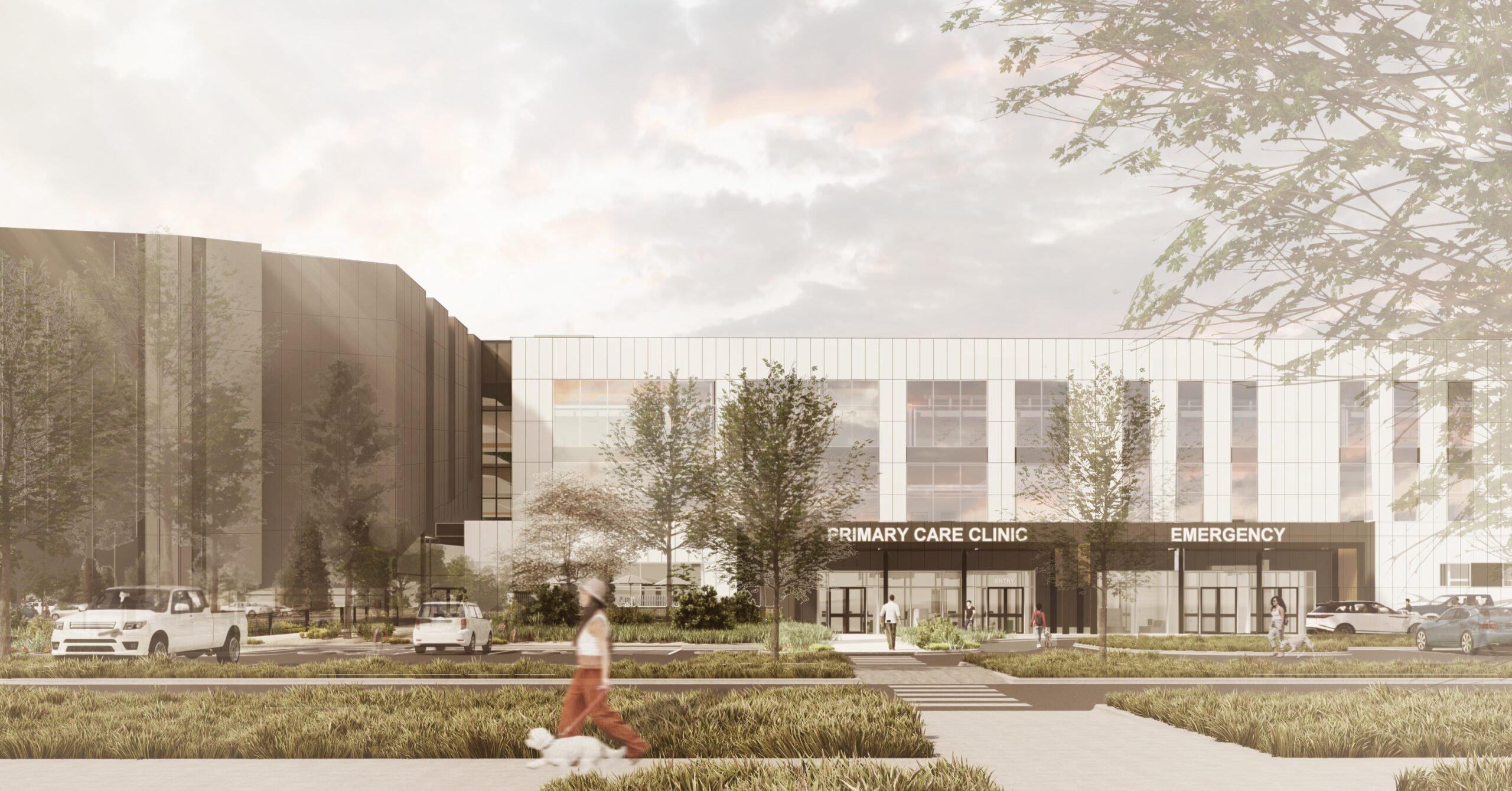 Its fear-free-inspired design prioritizes animal wellbeing with calming color tones, expansive access to natural light, and advanced sound-absorbing walls, among other anxiety-mitigating considerations. In addition to the custom glazing frit pattern throughout the facade, CSU’s health campus also houses exterior heated dog runs, a pharmacy with a premanufactured ISO7 cleanroom, and six isolated exam rooms to isolate communicable diseases. Once completed, the new building will be LEED Gold certified and a Bronze candidate for the WELL Building Standard—which would make it the first veterinary hospital in the country to achieve WELL certification.