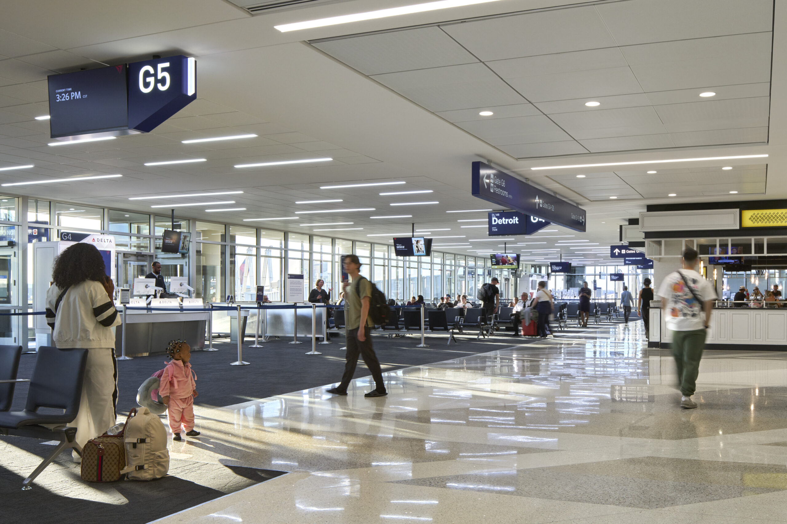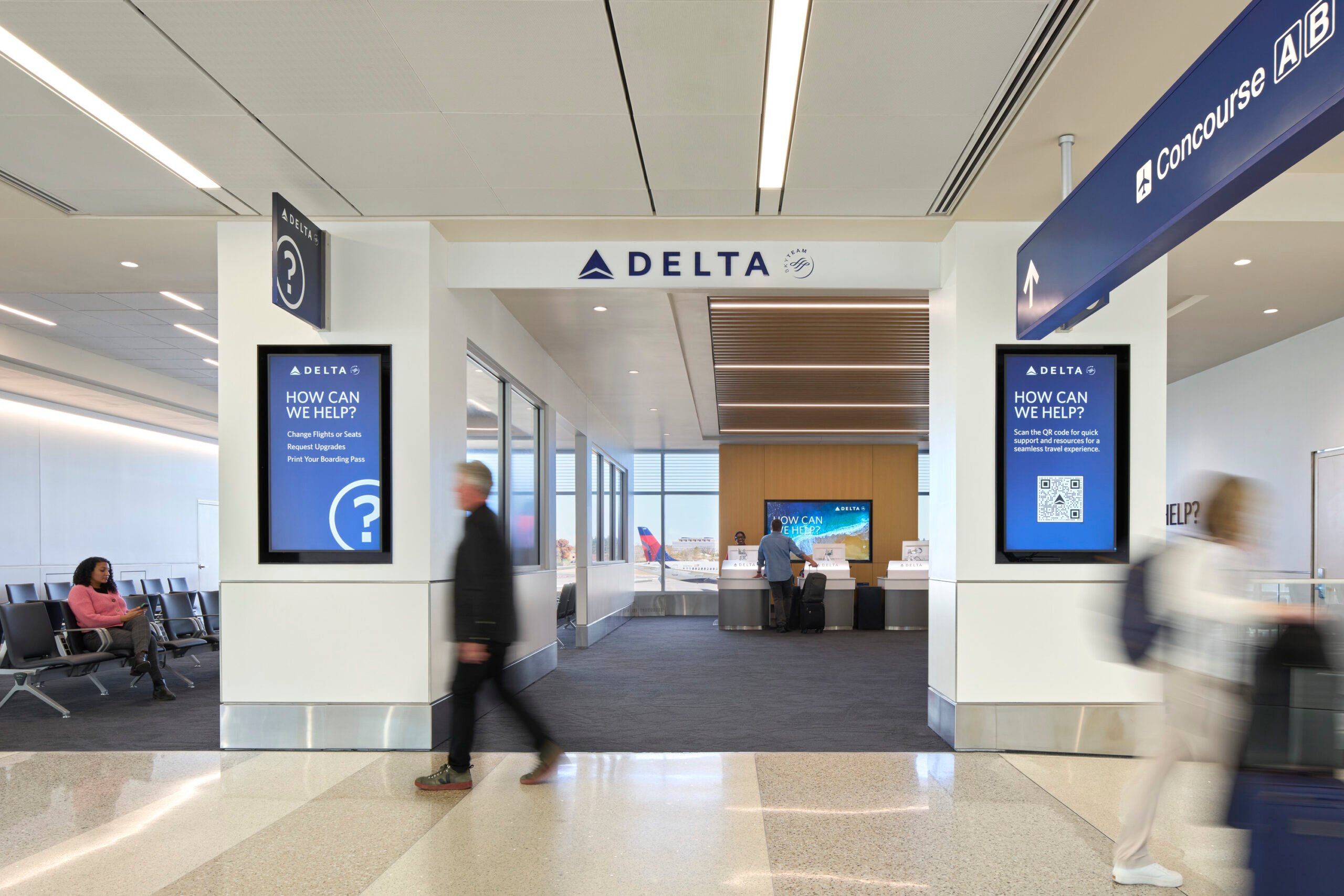The program delivered extensive improvements to 75 Delta Airlines gates. Travelers are now benefiting from new seating with built in power, redesigned gate podiums, upgraded carpeting, modernized information screens, and refreshed Delta branding aligned with the airline’s standards at other major hubs.