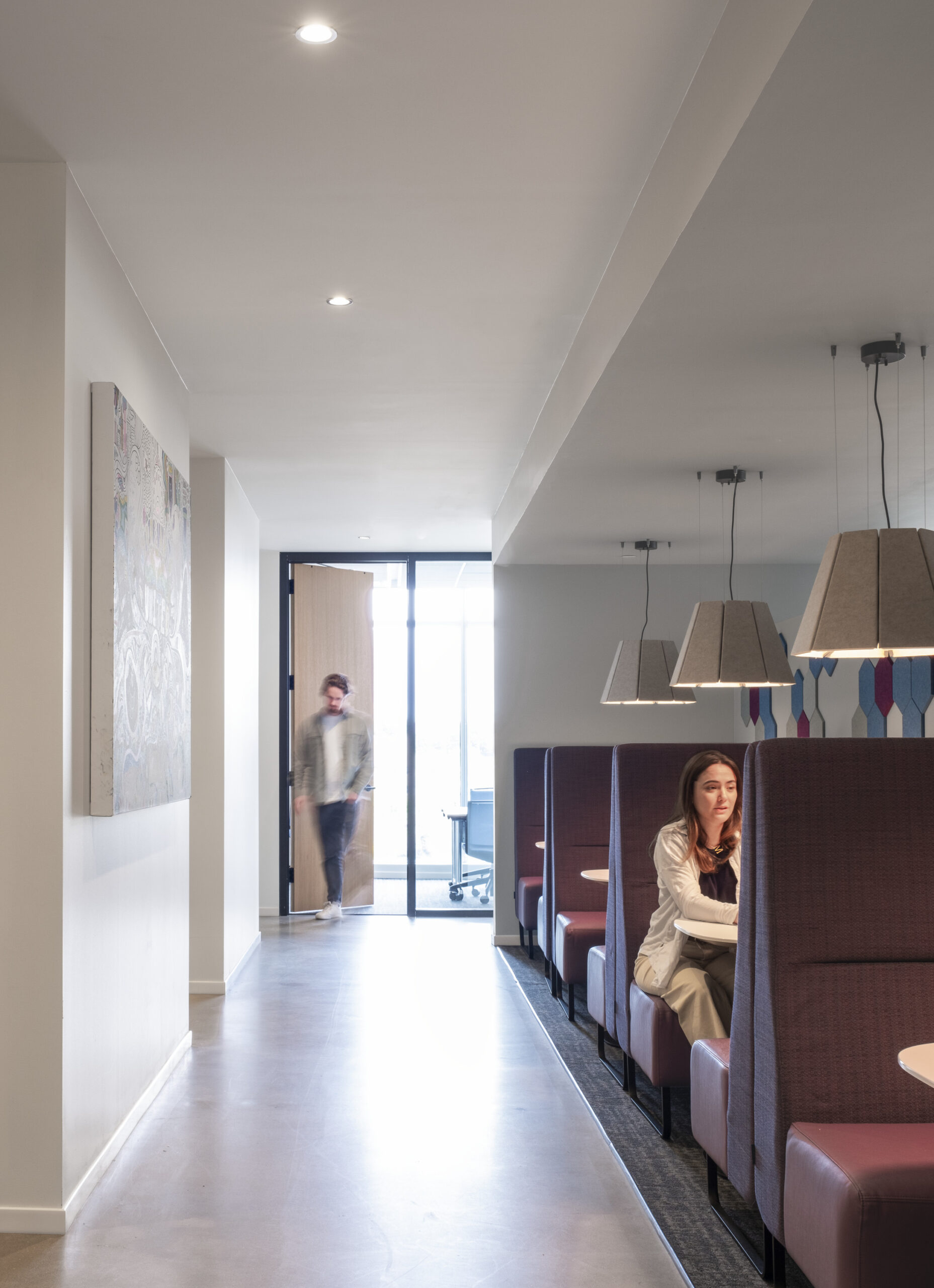 The finished space features open work areas, private offices, meeting rooms, and flexible collaboration zones to support a hybrid work model.